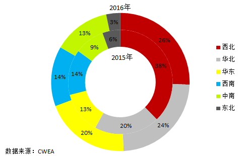 这与2015年相比,去年华北、华东以及中南三个区域的风电新增装机占比均出现了增长,华东地区占比由2015年的13%增长到了2016年的20%,中南地区占比则由9%增长到13%。2016年新增装机量减少最多的则是西北地区,占比由38%下降到26%;西南地区的占比则保持不变。