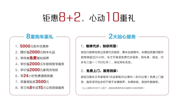 如果这只白猫戳中了你的心,接下来的消息一定会让你雀跃。因为欧拉白猫与天猫强强联合,现在上天猫长城汽车官方旗舰店购买欧拉白猫,还能享受8重购车豪礼+2大贴心服务,心动十重礼。(政策只针对个人用户,具体政策请咨询长城欧拉当地经销商)