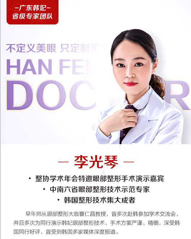 广东韩妃李光琴院长做美眼闻名于世,是华南地区非常有名的美眼口碑王,没有李光琴院长解救不了的眼睛,经过李院之手的美眼,都睁眼有神闭眼无痕,在业界是非常有名的!