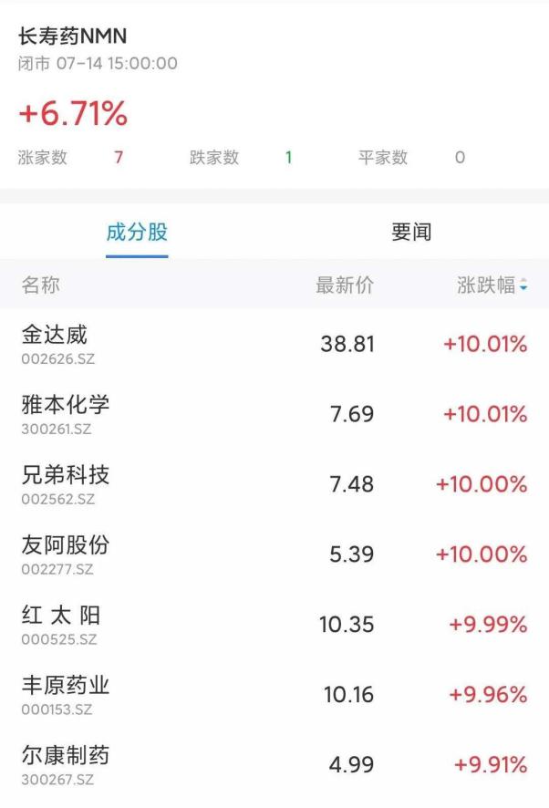 金融界7月14报道 NMN概念股爆发,金达威、雅本化学、红太阳等连日涨停。中信证券指出,2019年全球抗衰老市场规模1900亿美元,同比增长8.3%,根据测算,NMN行业远期有望达到千亿规模。