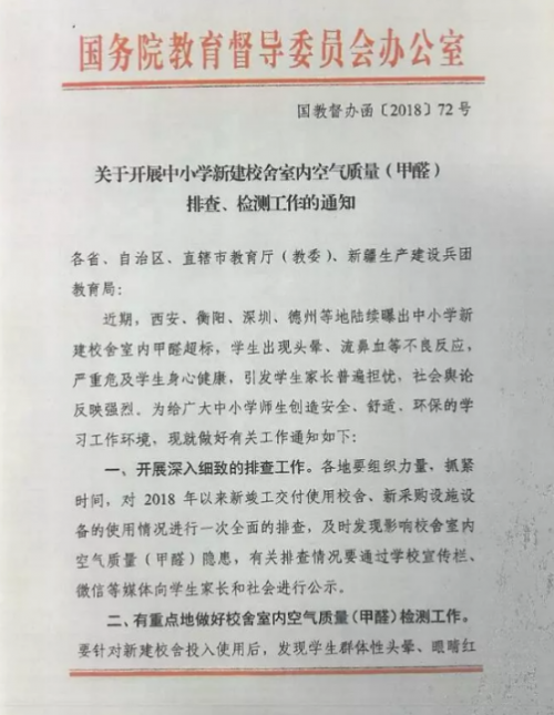 (1)2018年,国务院教育督导委员会办公室下发《关于开展中小学新建校舍室内空气质量(甲醛)排查、检测工作的通知》:通知要求,各地要及时聘请有资质的第三方检测机构,对相关校舍和设施设备进行甲醛检测,对室内空气质量(甲醛)不合格的校舍要及时整改,检测合格后方可投入使用。
