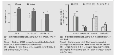 2.《中华实用诊断与治疗杂志》发表的文献报道,付等人对15名常规治疗的RA患者进行MSCs静脉输注,15名则为常规对照组,随访3月,结果显示:ACR20临床缓解状况评分、DAS28关节活动度评分和HAQ健康评分均有所改善,患者TNF-α、类风湿因子、C-反应蛋白水平等指标下降,血清IL-4、CD4+、CD8+比率升高,表明干细胞移植可提高RA患者机体免疫力,降低炎性反应及炎性因子水平。