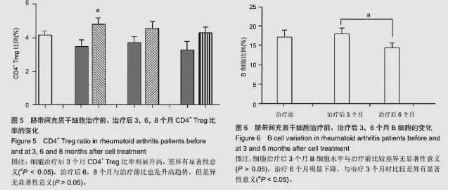 研究还观察到T细胞亚群中B细胞水平在细胞治疗后6个月较治疗前明显下降(P< 0.05),说明类风湿关节炎患者在干细胞疗法治疗后B细胞水平下降,促使了患者自身抗体(类风湿因子、抗CCP等)下降,抗体水平的下降可减轻结缔组织损害,缓解患者关节症状。
