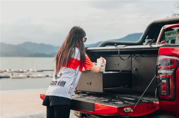 除此以外,得益于长5437mm、宽1958mm、高1893mm、轴距3230mm的大尺寸车身,这赋予长城炮越野皮卡十分卓越的装载能力。根据现场来看,各种大型工具都能一车带走,很赞。而且它的货箱与座舱采取分离的状态,这就实现了干湿分离,在隔离鱼腥味的同时,也避免了对座舱的环境干扰和卫生影响。
