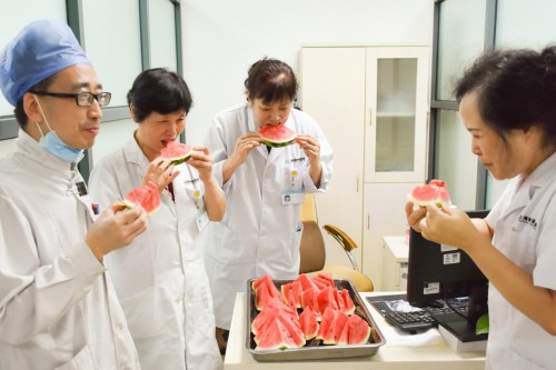 随后,医务科的同志将西瓜切成片分好等份,不仅让全院工作人员感受到徐女士的浓浓情意,也把这份真挚情意传递给当日到诊患者——感恩分享现场,和患者一起品尝。