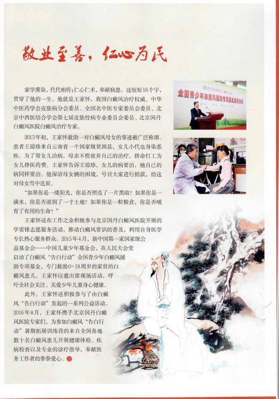 “想要当好医生,必须多花时间守在白癜风病人身边,密切观察病情,才能帮助白癜风患者解决根本问题”,这是王家怀主任常说的一句话。他不仅一心为患者,还乐意于公益活动,最近《雷锋》杂志报道了王家怀主任的公益事迹。
