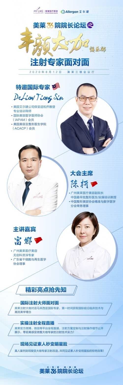 为推动医美行业医生微创注射技术的创新与前进,同时也为国内医生提供更专业更前沿的临床技术交流平台,广州美莱联合艾尔建公司共同举办美莱36院院长论坛之丰颜大咖俱乐部·注射专家面对面的国际学术交流会,会议将于2020年8月12日在广州美莱三楼会议厅开展。本次会议将邀请到马来西亚权威注射导师Dr.Liow Tiong Sin,与我院陈柯院长领衔的微整注射专家团队共同研讨最新的临床技术、潮流美学理念以及未来发展趋势。