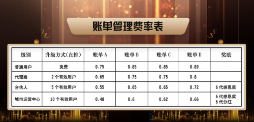 第三收益6代感恩奖励:如G是客户F是城市运营中心G使用账单1万手续费为75元,F收益25元,将会收取总佣金的6代%2=%12也就是3块,分为F-E-D-C-B-A均可获得0.5元感恩奖励,此项奖励佣金客户进行每笔消费是时候是秒结给上级代理代