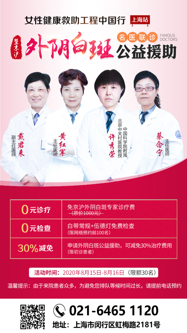 上海虹桥医院皮肤8月15-16日|女性健康救助工程暨京沪外阴白斑专家公益联诊,0元检查30%减免,预约从速