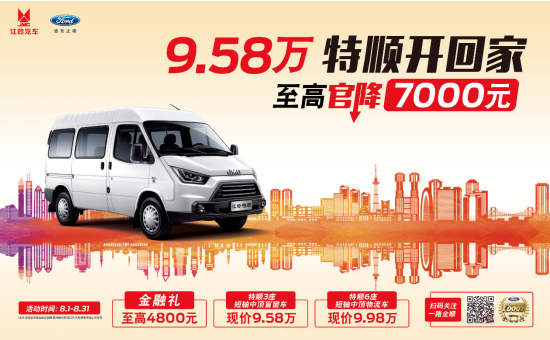 从具体车型来看,特顺盲窗车官降4000元,以3座短轴中顶盲窗车为例,官降后现价为9.58万元。而特顺其他车型均官降7000元,以明星车型特顺6座短轴中顶物流车为例,官降后现价为9.98万元。与此同时,即日起-8月31日活动期间购买特顺,还能享受至高4800元的金融礼,给予特顺车主真正的实惠,助力其创富之路一路特顺。