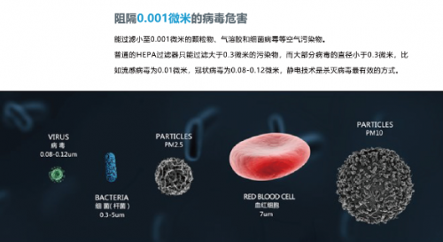 病毒可以吸附在飞沫、雾霾PM2.5、PM10、灰尘等不同的空气颗粒物上,净化器通过电离段让空气电离,使得颗粒物带上正电荷和负电荷,带电的颗粒物通过净化器的集尘段后,被强力吸附在集尘段内,集尘段同时也施加直流高压,继续对吸附在颗粒物上的病毒进行杀灭。