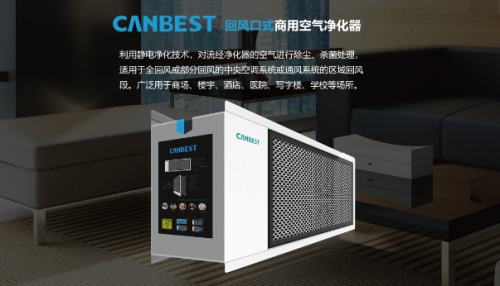 CANBEST回风口式商用空气净化器,适用于通风中央空调系统,安装于空气加热、制冷或通风系统中,可有效去除通过其循环空气中的悬浮颗粒物,如灰尘、烟雾、香烟味、花粉、细菌、病毒、孢子等;能满足大多数风机盘管安装尺寸,可下抽取进行清洗,最大程度不破坏现有装修。