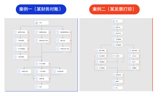 实在智能自研的RPA流程引擎相较于传统的开源的Work Flow的流程引擎,它能支持复杂场景的流程设计,并支持多任务进行以及支持流程节点的异常处理。以下面两个真实的案例客户为案例: