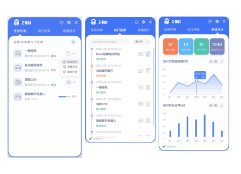 任务的执行者,其中Bot包含三种模态:任务式,流程式,交互式。它们可以灵活部署在客户端设备上,并通过时间轴和数据看板的方式展现Bot各个时间节点上,每个任务执行情况以及执行结果,让效率进一步得到提升。同时Bot也具备了Z-Commander的一些基础的能力,它可以脱离Z-Commander的进行灵活的一个控制,灵活的任务管理,灵活的定时任务设定。
