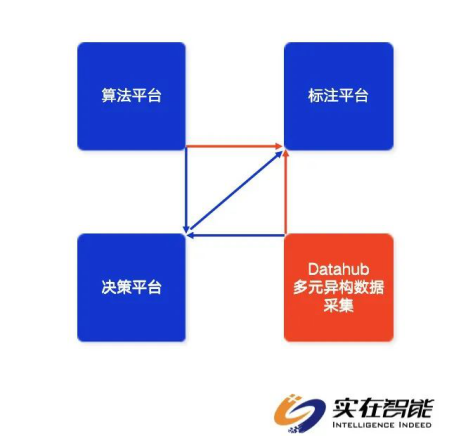 首先是云脑部分的起点——Data Hub多元异构数据平台,由它接触客户的业务系统,进行数据的采集以及进行简单的处理,并将处理过后的数据传输到标注平台,再由实在智能的业务专家,在标注平台进行业务能力的一个标注,实现人工智能的人工部分,通过标注过后的数据,再以在线的方式传输到算法平台,相当于人工智能有了数据的石油,算法平台里面可以进行数据的提炼(预处理),包括模型的构建、参数的设置、模型的训练以及最后的打包发布,可以将模型直接发布到决策平台,由决策平台来进行业务的对接以及模型的一个计算,决策平台会将后续从Data Hub过来的业务环境的数据进行一个模型的计算,最终输出计算结果或者是决策方案,然后由这个方案发布送到Commander来调度具体的Bot来进行根据决策进行相应的一个执行。
