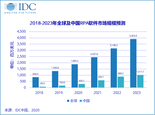 据国际数据公司(IDC)于5月5日发布的《中国IPA(智能流程自动化)市场机会分析》报告显示,到2023年,中国RPA软件市场规模将达到10.2亿美元,2018-2023年复合增长率为64%,中国RPA市场具备较强增长动力。金融、制造、零售、电信、政府/公共事业等各行业已经开始积极采用RPA技术,并已在特定业务场景流程中进行POC或在1-2个功能领域部署RPA应用。