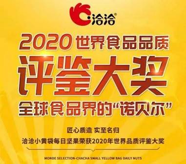 5月25日,“洽洽小黄袋每日坚果”获得素有食品界的“诺贝尔奖”之称的世界食品品质评鉴大奖。6月3日,洽洽小黄袋每日坚果凭借掌握关键保鲜技术的优势,连续2年蝉联“世界顶级美味大奖”。该项荣誉代表世界食品最高美味标准,被誉为食品届的“奥斯卡奖”,洽洽小黄袋连续2年摘得桂冠,再获世界顶级舌尖肯定,洽洽食品闪耀世界舞台。