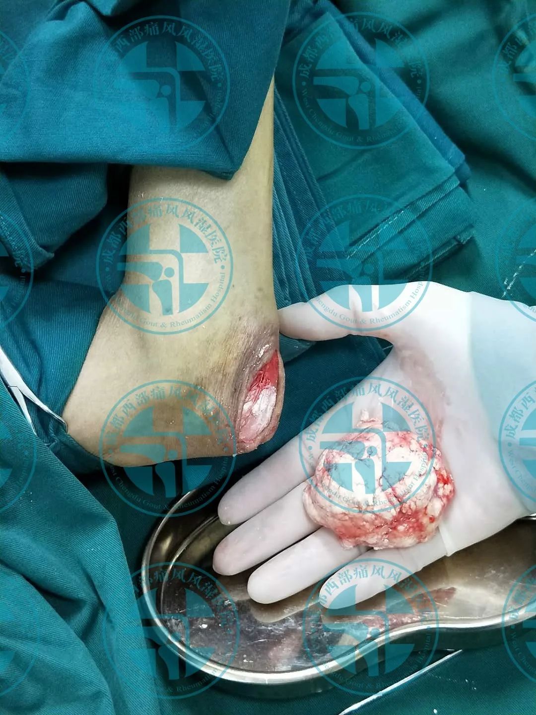我院近期手术的一位患者,右手肘部位取出鸭蛋大小的痛风石
