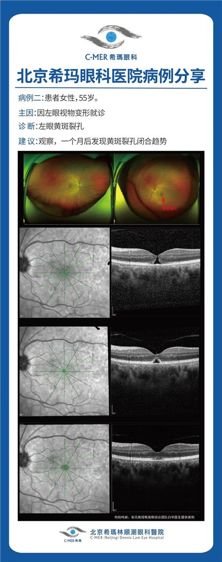 近期,北京希玛眼科的眼底眼综合医生团队就迎来了这样一位特殊的患者,特殊之处在于未经手术治疗,其黄斑裂孔在一段时间的随诊观察后竟出现了自行闭合的良好转归。