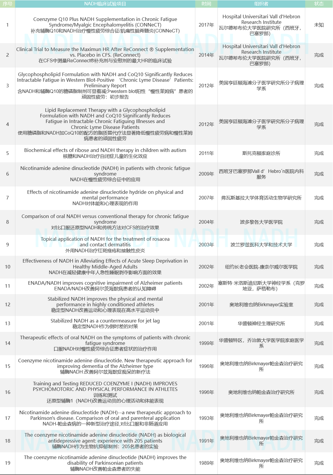 NADH已有19项人体临床试验