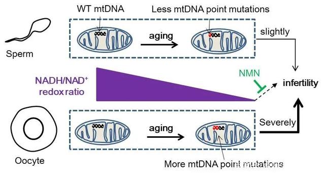 2020年2月,新南威尔士大学医学院Lindsay E. Wu的研究组发表于《Cell》子刊的研究发现,NADH和NADPH在卵母细胞中的水平随着年龄的增长而下降,导致小鼠的卵母细胞功能失调,生育力下降。并证明对处于繁殖期而不孕的雌鼠补充NMN后可提升卵母细胞的NADH和NADPH水平,从而恢复卵母细胞质量,提高排卵率和生育能力。
