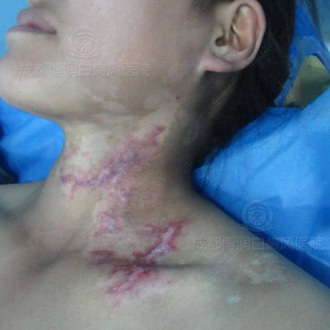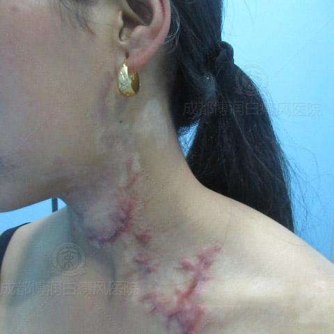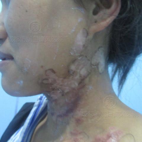 起初,使用偏方熬药外擦的时候,白斑处就有刺痛的感觉,以为是药物的正常反应,就继续使用。本以为白斑很快就会好,没想到颈部的白斑开始发炎,肿痛,破溃,甚至疼痛难忍。因为伤口破溃感染导致白斑迅速扩散至更大,原来白斑的部位也出现了很多瘢痕,给小橘带来了沉重的打击。