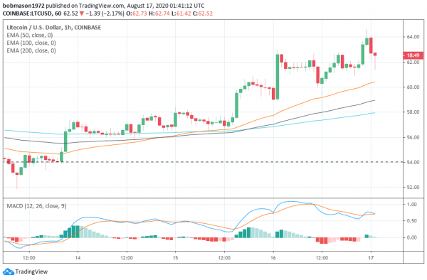 避开第一主要支撑位57.35美元,莱特币上涨至最后一小时盘中高点64.64美元。