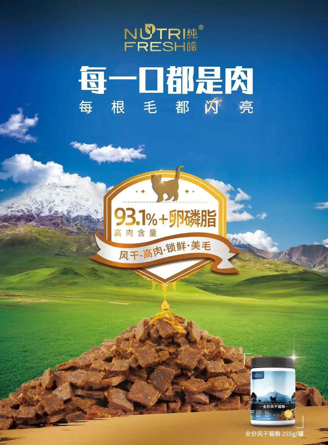 主要成分为优质鸡肉和其他肉制品、菊糖、卵磷脂。93.1%高肉及其制品含量,满足猫咪肉食天性。含卵磷脂,维护角质蛋白生长,滋润被毛;还有菊糖,促进有益菌增值,维护肠道健康,提升免疫力!