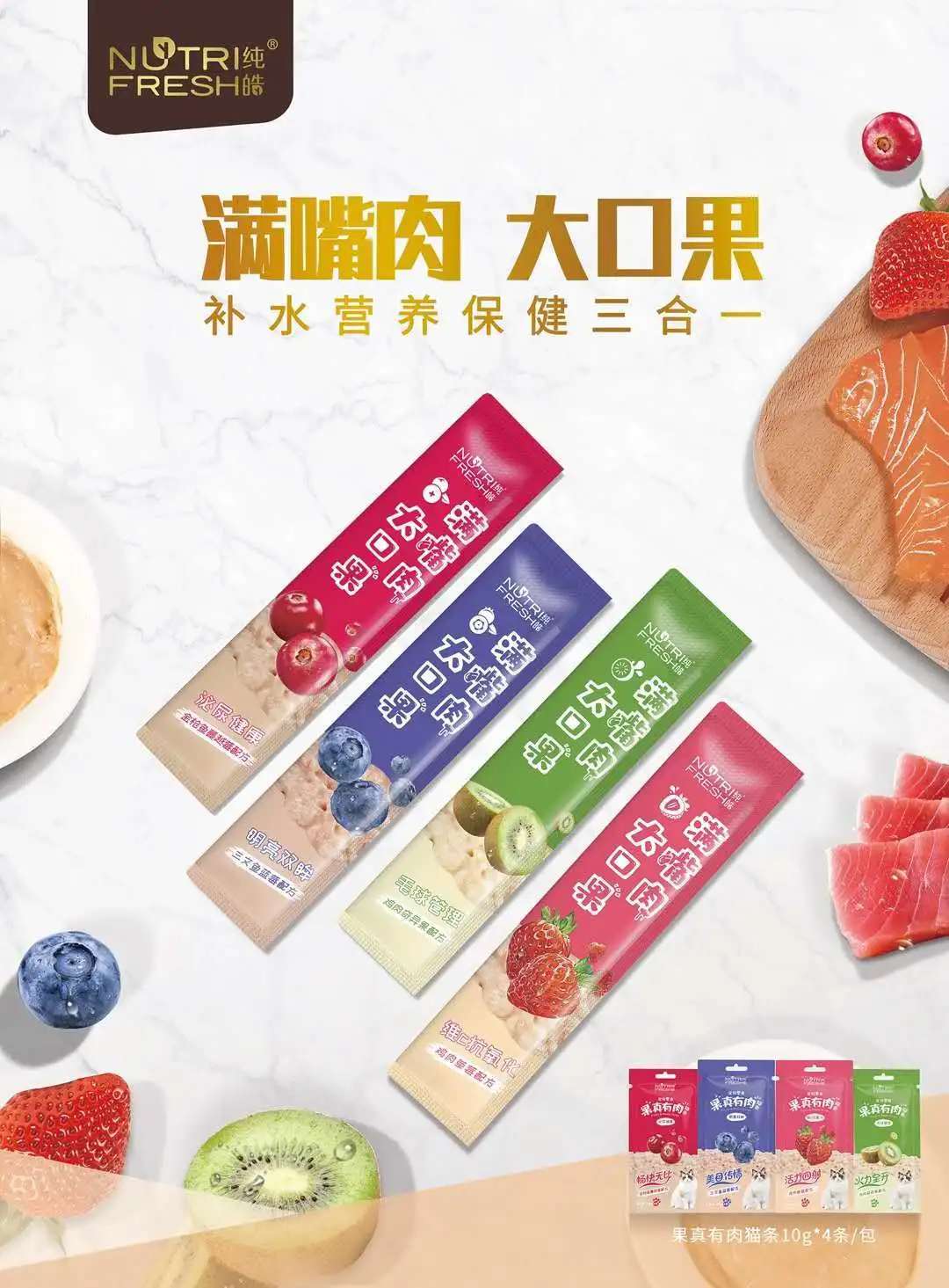 纯皓宠物零食果真有肉猫条: 区别市场大部分的猫条,纯皓新品果真有肉猫条,果肉碰撞,1条=N个水果精华提取,丰富水分、维生素、微量元素,一共有四种口味,鸡肉草莓配方:丰富鸡肉和茶多酚,抗氧化 强免疫。鸡肉奇异果配方:有利于毛球管理。 三文鱼蓝莓配方,吃出亮眼美猫。 金枪鱼蔓越莓配方,有利于调整肠道,多种功能,任君选择。这不仅仅是一条零食,更是补水、营养均衡、保健 三合一的功能型猫条。