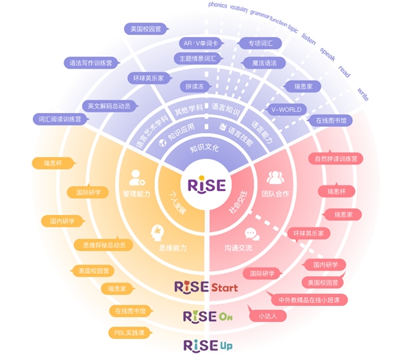 瑞思英语采用K12素质教育体系,产品覆盖知识文化、个人发展和社会交往三大领域能力;辐射语言技能、知识应用、团队合作、沟通交流、思维能力和管理能力六大核心素养。