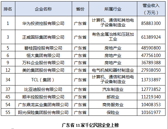 从榜单中广东11家千亿民企来看,房地产业企业数量最多,占据3席,分别为恒大、碧桂园、万科;其次为计算机、通信和其他电子设备制造业,分别是位居榜首的华为和TCL集团。据了解,今年新增入列千亿俱乐部的鼎龙集团,则是一家多元化发展的企业。