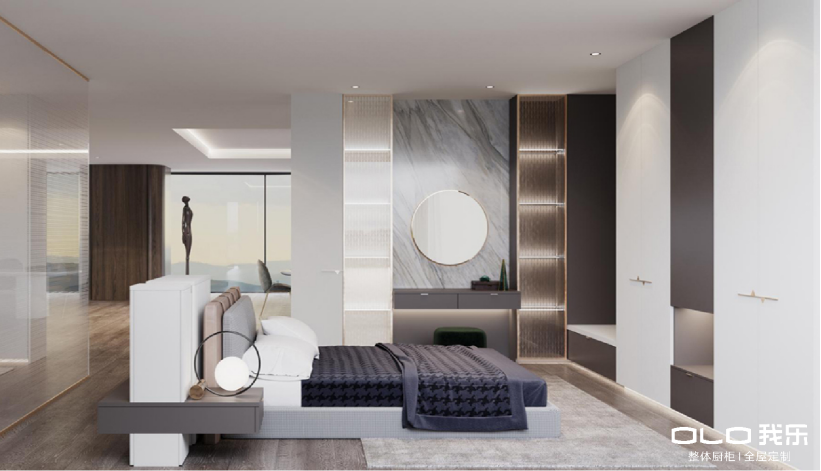 以我乐家居莫兰迪系列全屋定制为例,该系列以经典的高级灰色调为主体,再赋予50°雾感灰的婴儿般肌肤质感,让空间呈现出了高端又柔和的气质。