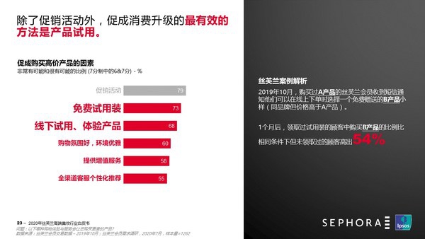 2019年10月,丝芙兰曾向购买过A产品的会员发送短信通知他们可以在线上下单时选择一个免费赠送的B产品小样(同品牌但价格高于A产品)。1个月后,领取过试用装的顾客中购买B产品的比例比相同条件下但未领取过的顾客高出54%。