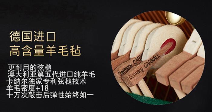 投入了大量的资金进行研发以及专利的创作。最终铸就了133cm的黄金高度,采用卡纳尔制琴研究团队全新一代的马克,大腔体音源系统设计,使音色更加圆润饱满。选材上采用了德国进口高含量羊毛毡,更耐用的弦槌,澳大利亚第五代进口纯羊毛,卡纳尔独家专利弦槌技术,羊毛密度+18,十万次敲击后弹性始终如一。