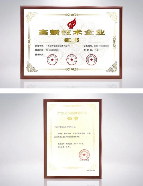 四季优美将古法工艺与现代科技相结合,自建了产业园和自动化的生产线并荣膺了由广东省科技厅、广东省财政厅、广东省税务局联合颁发的国家级高新技术企业认定证书,科技研发实力与持续创新能力受到肯定。同时,随便果也获得了由广东省高新技术企业协会颁发的广东省高新技术产品证书。