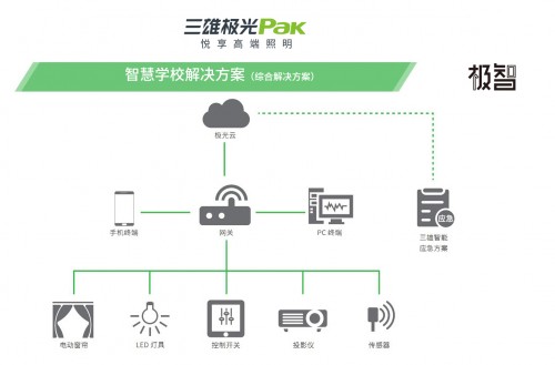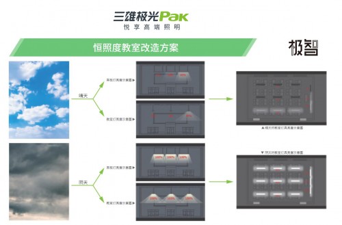 三雄极光智慧学校整体解决方案的人性化还不止这些。在智能教室改造基础上配套光敏传感器,当外界入射光线变强时,教室灯将自动降低亮度,充分考虑节能的同时,也使得课桌面照度恒定在国家标准要求的300lx以上。当遇上阴雨天气,它能监测学生桌面的照度,如低于300lx就会控制教室灯具慢慢开启,并调整教室灯具的亮度,使学生桌面照度恢复到300lx以上。这就是恒照度照明系统,比现有常规照明方案平均节能4.5W/㎡,值得推广普及。
