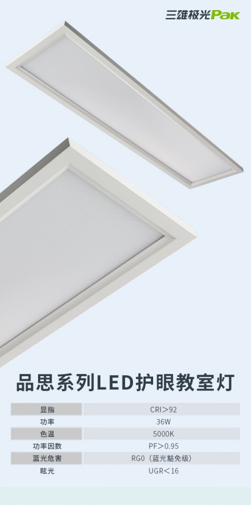 目前三雄极光研发的教室专用灯产品种类丰富,能满足不同城市地区学校的照明需要。以品思系列为例,该产品采用专利银离子防眩涂层技术扩散板,有效降低灯具眩光值。除了灯具统一眩光值<16,品思系列教室灯具还身负蓝光认证、频闪报告、光生物安全报告、光色性报告等多项认证,这些都是提升教室照明质量的重要指标。