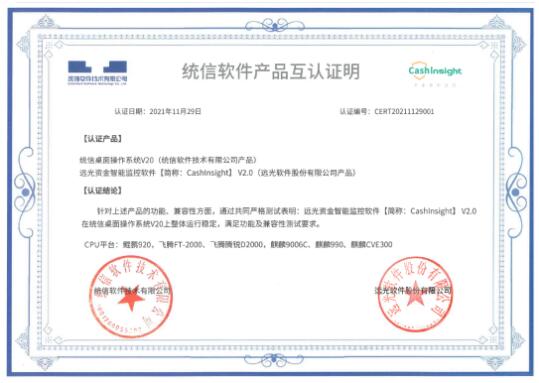 统信桌面操作系统V20是统信软件基于Linux开发的一款自研桌面操作系统,兼容国内主流处理器架构,拥有丰富的硬件、外设和应用软件生态支持,可为企业级关键业务、云、容器、大数据、人工智能,以及工业互联应用场景,提供可靠、安全、高性能的承载支撑。本次通过统信桌面操作系统V20兼容互认证,意味着远光资金智能监控软件CashInsightV2.0在支撑国产信创产业发展道路上迈出新的一步,丰富了国产化适配软件的应用场景,保证了产品的自主可控、安全可靠。