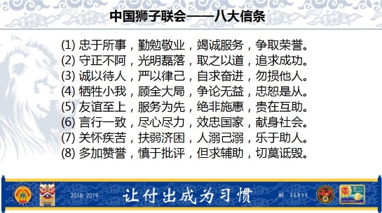 今天我非常荣幸成为香江服务队1819年度队长,我将传承和发扬香江服务队严谨规范的工作风格,继续努力践行我们的初心,在未来的日子里将和香江队30位狮兄狮姐携手完成使命。
