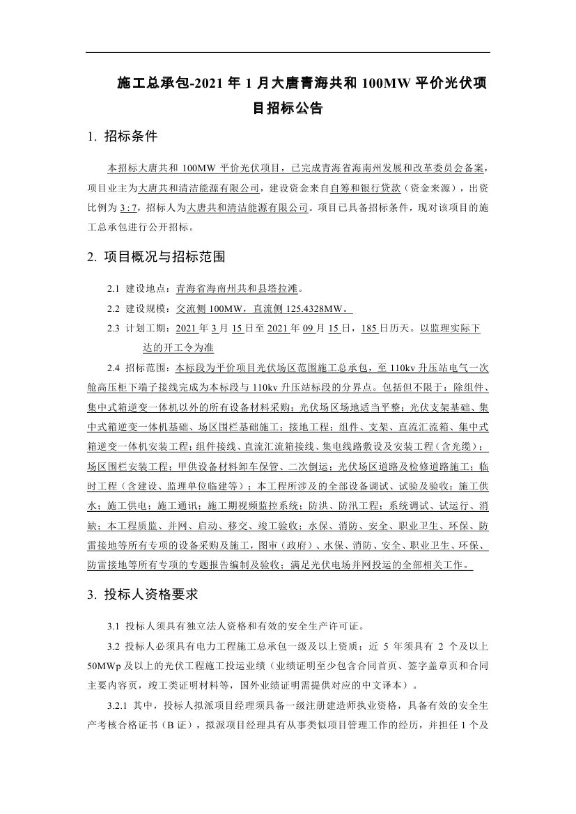 近日,集团电子商务平台发布2021年1月大唐青海共和100MW项目招标公告。