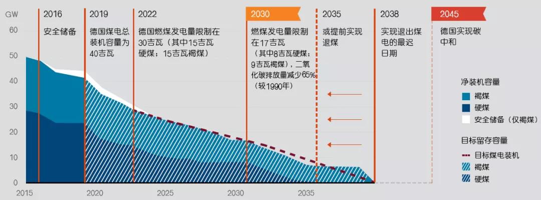 考虑到对煤炭逐步退市的各种意见和担忧,德国政府成立了经济增长、结构变革与就业委员会,即退煤委员会。其任务是确定如何能够以协调环境、社会和经济问题的方式完成煤炭的淘汰。2019年1月委员会发布了退煤路线图,决定逐步关闭煤电厂,在2022年将装机容量从2019年的40吉瓦减少为30吉瓦,在2030年降为17吉瓦,最后在2038年全部退出。