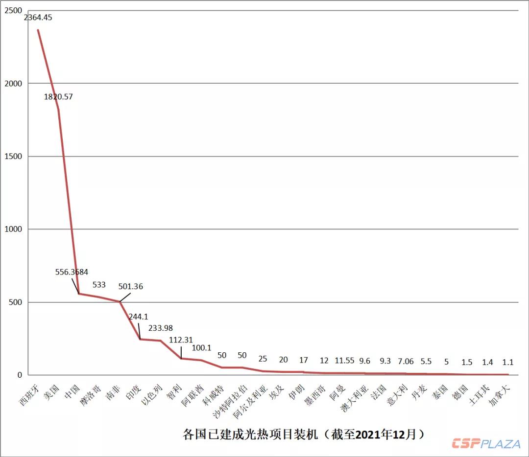 表:2021年各国光热电站建成总装机规模(注:虽然CSPPLAZA已尽可能统计了所有项目,但全球范围内仍可能存在部分小型光热项目未被统计,如有纰漏,敬请指正。)